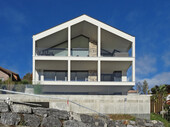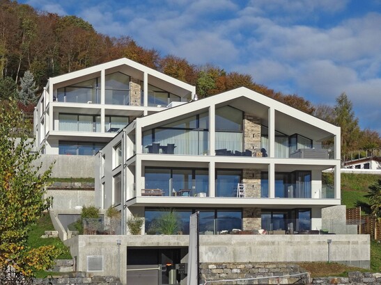 Die Lage ist traumhaft. Wohnen in der Überbauung Lee Side in Faulensee bedeutet Wohnen mit Blick auf den See und die Alpen. Die beiden Wohngebäude liegen leicht erhöht oberhalb des Thunersees. Das auskragende Dach wurde mit Platten aus Brettsperrholz konstruiert.