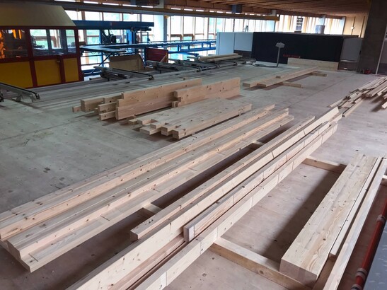 Die Höhe des Trägers der Plattform, der über die gesamten 15 Meter gespannt ist, war begrenzt. Der Grund: Auf der unteren Seite sollte die Zuführung für die Plattenbearbeitungsanlage zu liegen kommen, auf der oberen Seite sollte der Träger nicht zu hoch über die Plattform hinausstehen, damit der Stapler die Pakete mit dem Holz abtransportieren kann.