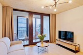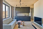 Das Gebäude wird durch den mittigen Kern und die Brandmauern getragen, die Strassen- und Hoffassaden sind als flexible Skelettstrukturen ausgeführt. Auf 5 Etagen gibt es je drei 2.5 Zimmer Wohnungen, wobei die obersten als Duplex ausgebildet sind.