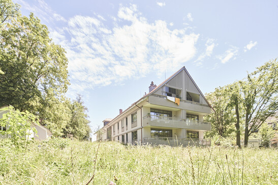 Das Mehrfamilienhaus in Zürich Wollishofen ist komplett in Holzbauweise, inkl. Treppenhaus, erstellt. In diesem Bau auf der Anhöhe des Aspweges entstanden sechs neue Wohnungen, verteilt auf zwei Vollgeschossen und einem Dachgeschoss.
