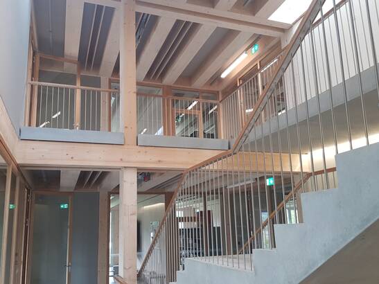 La nouvelle école combine la construction en bois massif et la construction à ossature habilement : Tous les planchers et une partie des murs intérieurs pour le contreventement du bâtiment sont construits en bois massif de bois lamellé-collé. Les autres murs intérieurs sont des cadres non porteurs. constructions à ossature. Les surfaces chaudes des murs et des plafonds en bois, ainsi que le l'échange permanent entre le bois et l'humidité de l'air créent un bon climat intérieur. climat intérieur. Des murs bien isolés sont importants : en effet, plus la différence entre la température de surface des murs, des sols et des plafonds et celle de l'air ambiant. température de l'air, plus il fait bon vivre dans une pièce. C'est pourquoi nous nous sentons dans les bâtiments en bois bien isolés, même lorsque la température est un peu plus basse. température ambiante. Les bâtiments peuvent ainsi être exploités de manière plus économe en énergie. De plus, la température Le bois donne l'impression d'avoir une température de surface plus élevée que le béton, l'acier ou le verre, ce qui Le bien-être est encore plus grand.