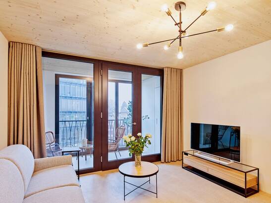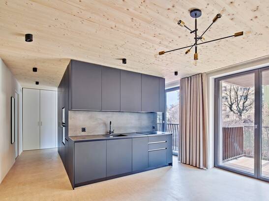Les Liv Suites, situées dans un immeuble en bois de sept étages au cœur de la ville de Lucerne, offrent une expérience de vie moderne. La façade en bardeaux attire le regard. Des essais de résistance au feu ont permis de réaliser le revêtement continu en mélèze sans tabliers ni barres coupe-feu gênants.
