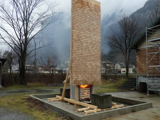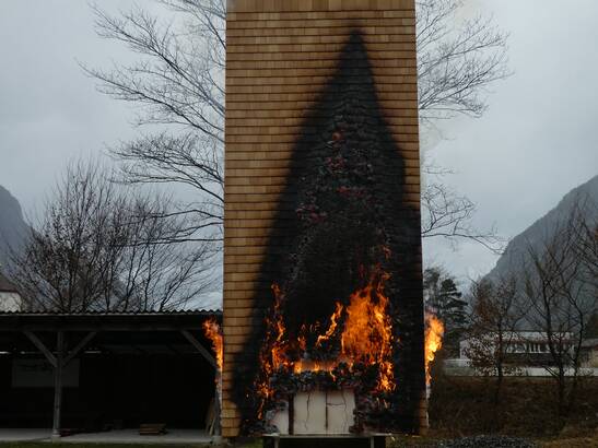 Lors des essais à Andermatt, un premier essai au feu à petite échelle sur un échantillon a permis d'évaluer grossièrement le comportement au feu. Dans un deuxième temps, en accord avec les autorités, un essai d'incendie réel a été réalisé sur un morceau de façade.