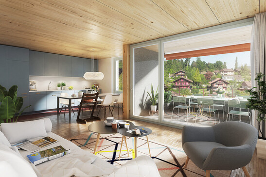 Densification interne, construction en bois conséquente et durabilité, planification numérique du projet en BIM, comportement en matière de mobilité et renoncement à un parking couvert : tous ces thèmes actuels sont réunis dans le projet de construction de 22 appartements locatifs près de la gare de Niederscherli.