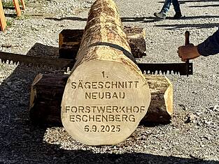 Début des travaux pour le nouveau centre forestier d'Eschenberg : après une phase intensive de planification et de conception avec Timbatec, spécialiste de la statique des constructions en bois, le centre devrait être remis à l'exploitation forestière fin 2026, après un coup de scie symbolique donné par les conseillers municipaux.