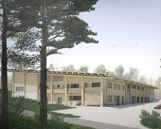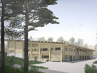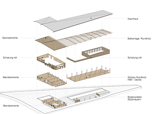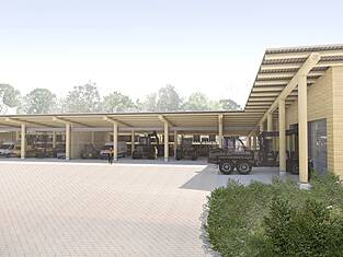 Le nouveau centre forestier comprend un bâtiment d'exploitation à deux étages en bois et un hangar pour les machines, les outils et les véhicules. Plus de 95 % des matériaux proviennent des forêts appartenant à la ville. Une attention particulière a été accordée à un traitement minimal : la structure porteuse du hangar est constituée de rondins provenant directement de la forêt. Le reste du bois d'épicéa et de sapin a été transformé en planches, poutres et bois lamellé-collé dans une scierie voisine et chez des transformateurs régionaux, puis renvoyé progressivement sur le chantier. Les trajets de transport courts rendent le nouveau bâtiment particulièrement économe en énergie et permet de stocker du CO₂ ; le chauffage est assuré par du bois de chauffage provenant de la ville.