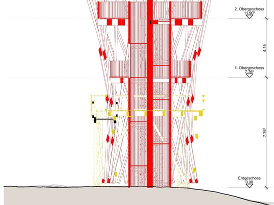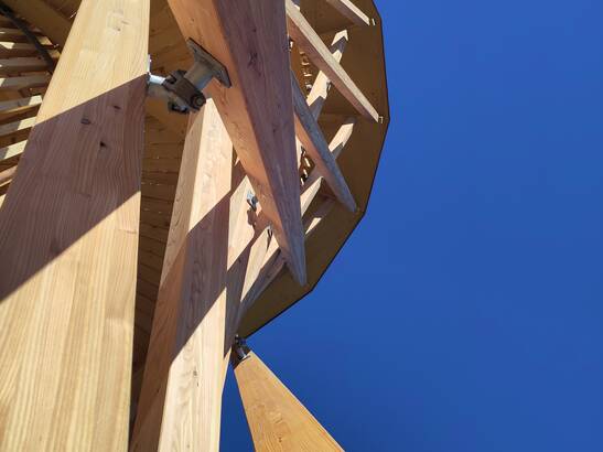 Deux types de bois ont été utilisés : du mélèze pour la structure extérieure exposée aux intempéries et du bois d'épicéa pour l'intérieur protégé de la tour. La construction repose sur des fondations massives en béton et se termine par un toit à végétation extensive - une plus-value écologique qui crée un espace vital supplémentaire pour les insectes.