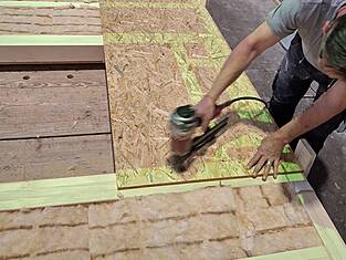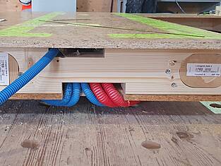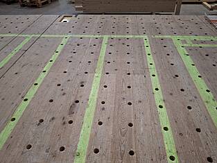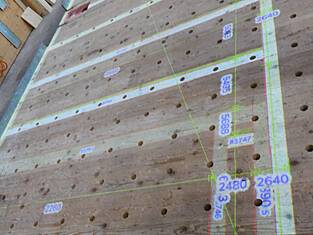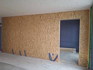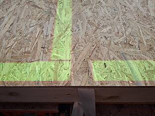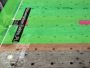 Deux projecteurs de plafond ont permis de visualiser les processus de fabrication pour la construction, l'isolation, les tubes électriques et les revêtements directement sur les tables des éléments. Cela a permis aux collaborateurs de clouer avec précision le parement sur les nervures et de positionner exactement les trous, les évidements et les éléments encastrés. Les dépassements de plaques et les coupes en retrait ont également été visualisés, ce qui a permis de supprimer en grande partie les mesures manuelles et d'économiser un temps précieux.