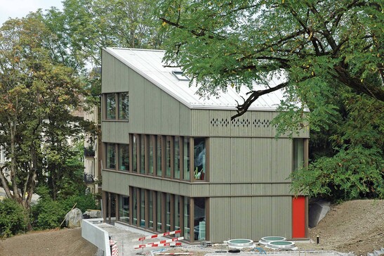 La façade des trois étages supérieurs de la garderie est une construction en bois qui supporte les plafonds en béton. Cela signifie que le plafond a été coulé sur des éléments de façade préfabriqués en bois. Cette solution a pu être réalisée parce que l'architecte et Timbatec en étaient tous deux convaincus. Dans la planification, il semblait entre-temps qu'une solution avec des piliers en acier serait retenue - bien que l'architecte Rossbauer ait remporté le concours municipal pour la garderie avec une construction entièrement en bois. Grâce à l'engagement des architectes et de Timbatec, les avantages du bois ont finalement pu être exploités.