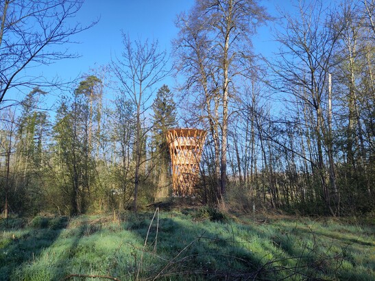 La tour d'observation, achevée en 2025, est située sur la rive gauche de la Thur, vue depuis le pont de l'Ellikerstrasse, dans le sens du courant, directement au bord de la rivière. Avec ses 15 mètres de haut, c'est un bâtiment imposant, mais il s'intègre parfaitement dans le paysage alluvial. À huit et douze mètres de hauteur se trouvent deux plateformes sur lesquelles les visiteurs peuvent observer la nature et profiter d'une vue panoramique. Le projet est né d'un mémoire de master à l'ETH Zurich.