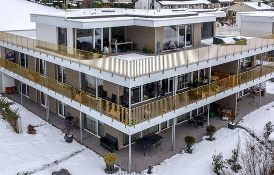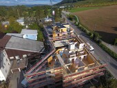 Les dimensions extérieures des deux immeubles collectifs ont été adaptées au plan non régulier du terrain. Il en résulte des plans de bâtiments irréguliers avec des murs inclinés et des étages en retrait. C'est surtout l'étage en attique décalé, pour lequel les charges devaient être supportées par le grand salon et la salle à manger situés en dessous, qui a représenté un défi. Les charges ont pu être supportées à l'aide de poutres en acier intégrées dans le plafond de l'étage.