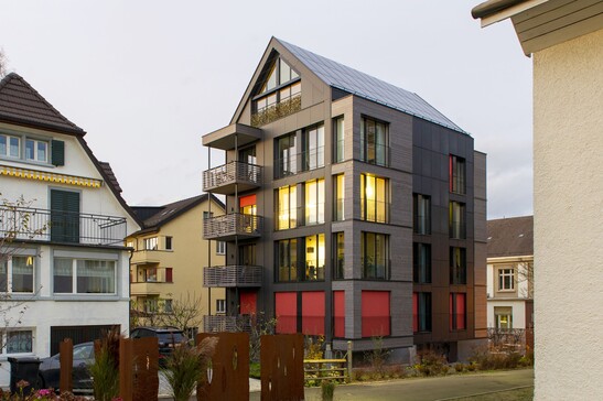 L'immeuble d'habitation à Dübendorf possède un sous-sol en béton armé et, au-dessus, 5 étages en bois avec une cage d'escalier en bois. Au total, le bâtiment compte 5 appartements au rez-de-chaussée et au premier étage. Le sous-sol ne contient que des caves et des locaux techniques. La façade est en partie occupée par des modules photovoltaïque et recouverte d'un bardage horizontal en bois.