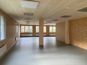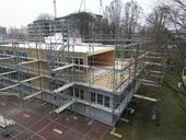 Pour permettre la rénovation d'autres bâtiments, le centre de formation de Muttenz a dû créer des locaux scolaires provisoires pour cinq ans. Pour ce faire, une construction modulaire de deux étages a été érigée, composée de six salles de classe et d'une salle de séjour pouvant accueillir jusqu'à 60 personnes. En raison de la charge en radon du sol, on a renoncé à des fondations traditionnelles et placé la construction sur un revêtement dur. Pour la construction modulaire, un système optimisé a été développé en collaboration avec le constructeur bois, permettant un (dé)montage rapide et sûr.