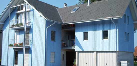 Les murs ont été construits en ossature bois. Un coffrage à lattes en T ventilé et peint de manière couvrante sert de peau extérieure. Les plafonds ont été réalisés sous forme de simples couches de poutres - un mode de construction quelque peu tombé en désuétude face aux nouveaux et nombreux systèmes de plafonds, mais qui est très économique.