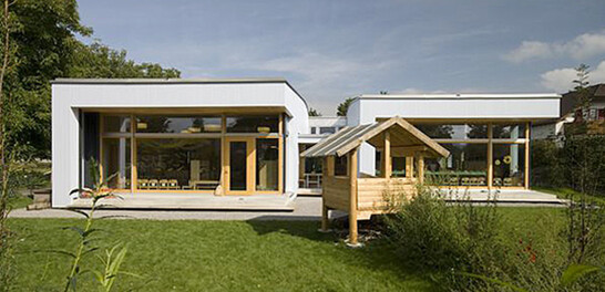 Outre le jardin d'enfants et les salles de classe, un local d'équipement détaché est intégré à l'aspect général. Le standard d'isolation de l'enveloppe extérieure est équivalent au standard Minergie. L'installation d'une aération douce et la certification n'ont toutefois pas été réalisées. La réalisation La structure porteuse du toit est librement tendue sur 8,70 m afin de créer des espaces aussi grands que possible sans être gênés par des piliers. Afin de pouvoir supporter les charges de la lourde structure du toit (végétalisation extensive), le toit est ponté par un caisson de lignature de 320 mm de haut.