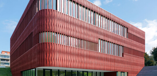 Afin de construire les grands porte-à-faux et de répartir les forces sur les fondations sur pieux, de hautes poutres en bois lamellé-collé ont été insérées dans le toit ainsi que dans les plafonds des étages. Les lanterneaux ronds ont constitué un autre point fort : grâce à l'appui filigrane en quatre points, le toit du lanterneau semble flotter sur la bande lumineuse qui l'entoure.