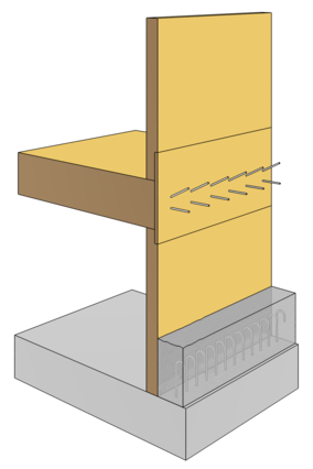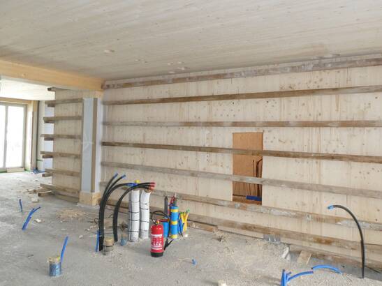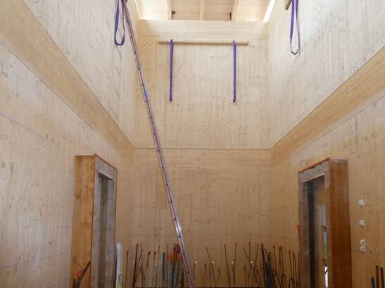 Les panneaux 3 plis de 42 millimètres d'épaisseur ont été recouverts de 3x15 millimètres de plaque de plâtre fibreuse du côté intérieur de la pièce pour assurer la protection incendie. De l'autre côté, la plaque sert de coffrage perdu pour le béton. Jusqu'à ce que le béton soit durci, la cage d'escalier est provisoirement renforcée.