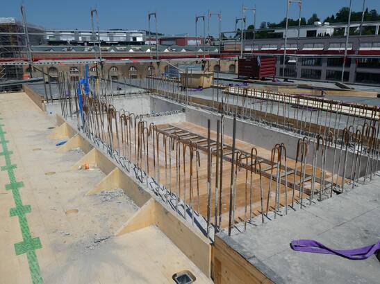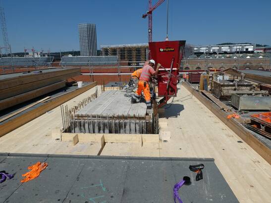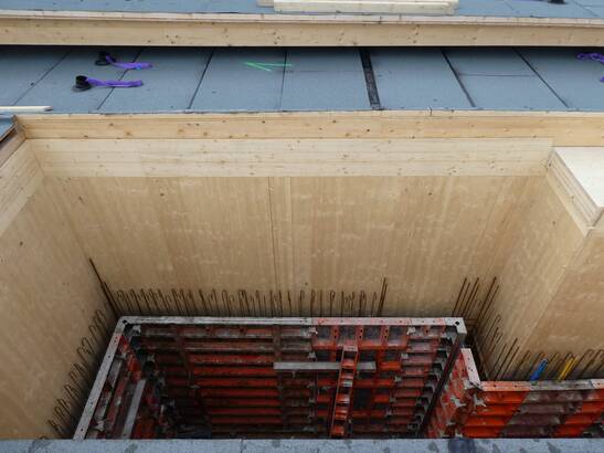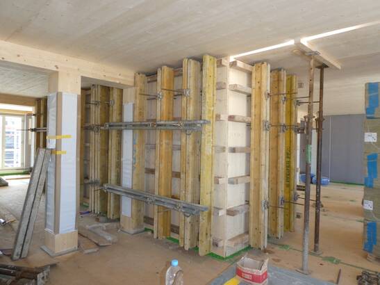 Les avantages de cette nouvelle approche sont évidents : il faut beaucoup moins de profilés en acier et de vis, la liaison entre la structure en bois et le noyau de béton est plus simple et le temps de construction est plus court. Le montage et le démontage de l'échafaudage et du coffrage pour le noyau de béton ne sont plus nécessaires et la quantité de béton utilisée peut être réduite. Et ce, à performance égale : le béton coulé ultérieurement est lié à la structure en bois par une liaison de forme et de force. Les noyaux des cages d'escalier servent au renforcement statique des bâtiments et garantissent les voies d'évacuation en cas d'incendie.