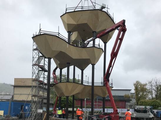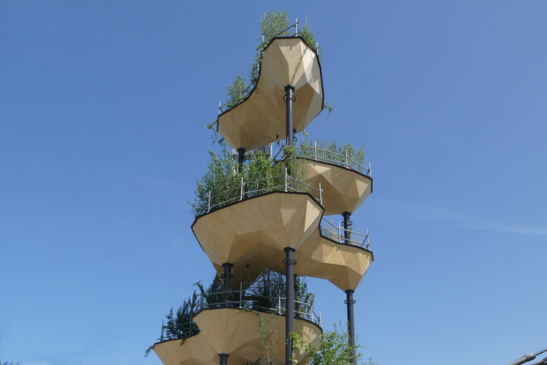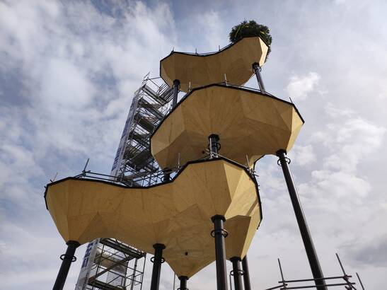 For the Tech Cluster Zug, researchers from the ETH architecture professors Fabio Gramazio and Matthias Kohler, together with together with Müller Illien Landscape Architects, Timbatec and other partners. partners built a planted architectural sculpture. The 22.5 meter high structure consists of five geometrically complex wooden shells, which - slightly slightly offset from each other - are supported by eight slender steel columns. Last Last week, the erection ceremony was celebrated with all those involved.