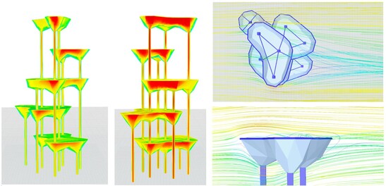 Robotic prefabrication is currently running at full speed. The individual formwork segments were continuously transferred to trucks in and the architectural sculpture will then be erected and finally erected in the spring of 2022. erected and finally planted. From summer 2022, it will be possible to to view the wooden structure from the ground and the buildings, and to take a look into the greened shells. The slender and tall structure will be lushly planted with large bushes and trees and will thus have a stately dead weight. At the same time, it represents a large surface of attack for the wind . Thanks to the advantageous round shape of the shells, the wind is guided around the structure. around the construction. Nevertheless, the stiffening of the structure with the eight slender slender columns is a challenge. The wind pressures on the shell were calculated with calculated with a fluid mechanical RWIND simulation from Dlubal Software, which simulates the flow around the structure in a wind tunnel. In addition resonance effects along and across the wind direction had to be taken into wind direction had to be taken into account in the calculations.