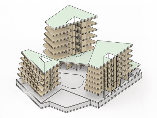 The buildings are classified in building class 5. Load-bearing components are thus subject to the fire-resistant requirement (REI90). The Schleswig-Holstein State Building Code (LBO) permits fire-resistant building components made of combustible building materials by supplementing §26 (2). Load-bearing components made of solid wood in building class 5 are also permitted by the model timber construction guideline.