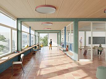 The primary structural framework consists of glued-laminated timber beams spanning in parallel axes. Due to the moderate spans, the cross-sections of the beams and columns can be optimized, resulting in a material- and resource-efficient structure with high load-bearing capacity and serviceability. The regular grid pattern enables cost-effective prefabrication and easy adaptation to the functional requirements of the units.