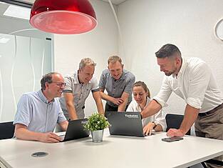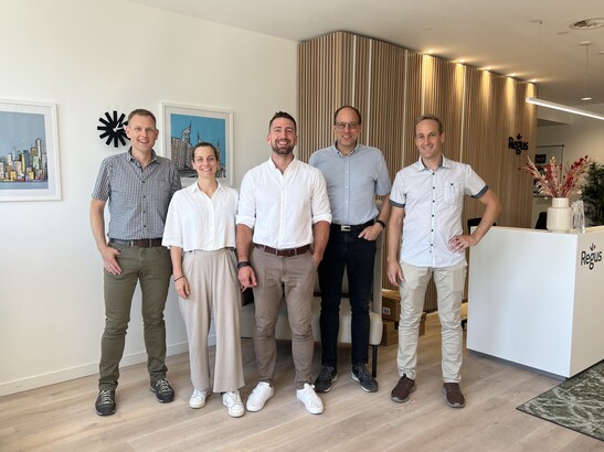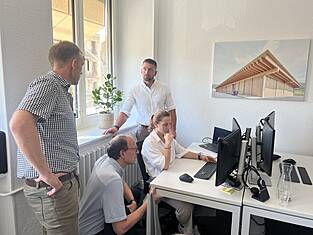 (from left to right) Lukas Rüegsegger (Chairman of the Bern site management), Laura Lips (timber construction engineer), Simon Vuilleumier (Chairman of the Lausanne site management) Andreas Burgherr (Chairman of the Executive Board), Johann Maître (Chairman of the Delémont site management)