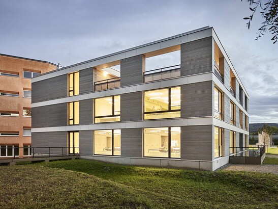 The existing Allmend school building, built in 1969/1970, had not met the requirements of today's teaching methods for some time. Due to the lack of special rooms, the school repeatedly reached its limits. For this reason, those responsible in the Zurich suburban community, which borders directly on Zurich's city districts 9 and 10, had a three-story extension built. The cubic new building, with a footprint of 25 by 25 meters, has three floors and is designed in such a way that one floor can be added later. In addition to five classrooms and group rooms each, the new building houses, among other things, a lounge with a small kitchen, a conference room and two offices. Each floor is directly connected to the existing school building via a connecting structure.