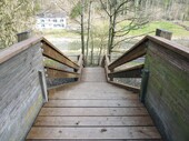 Based on the condition analysis, the pedestrian bridge was rehabilitated in such a way that it can be used until at least the year 2030. Timbatec was responsible for the entire execution planning as well as for the construction management. Main girders, their supports and steel structure could be retained. The complete stairway structure, the runway decking and longitudinal beams had to be completely replaced. The connection of the stairs to the terrain was also redesigned in order to better comply with the structural wood protection. The first two steps, made of wood in the original bridge, were newly made of concrete. All new wooden components were again treated with a pressure impregnation (Impralit-KDS chrome-free brown).