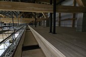 The design principle is based on a delicate interplay between the existing structure and the new boxes, which are suspended from the roof trusses by means of a metal profile construction that also serves as supports for the floors. The floors of the boxes are made of ribbed wooden panels, while the cantilevered rows of seats are made of cross-laminated timber (CLT) panels.