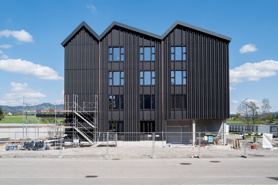 The basement and first floor are built in cast-in-place concrete, the three upper floors above are pure timber construction. The supporting structure consists of beech columns and beams with solid spruce ceilings above. In the roof, a truss was formed with the beech girders, which dictates the shape of the roof. Insulated hollow box elements are stretched over the trusses. A back-ventilated wooden formwork forms the facade cladding. The stairwell and elevator shaft walls were constructed with CLT panels. The slabs are all formed into slices, which transfer the forces from wind and earthquakes into the bracing walls. The stairwell and elevator core walls, as well as individual exterior wall elements, were used for bracing.