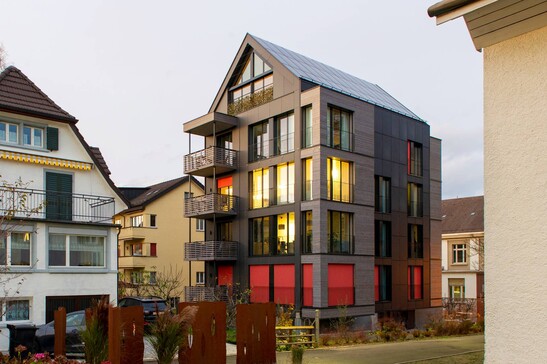 The apartment building in Dübendorf has a basement in reinforced concrete and 5 floors above in wood with a wooden staircase. There are a total of 5 apartments in the building on the ground and upper floors. The basement only contains cellars and technical rooms. The facade is partly covered with PV modules and horizontal timber cladding.