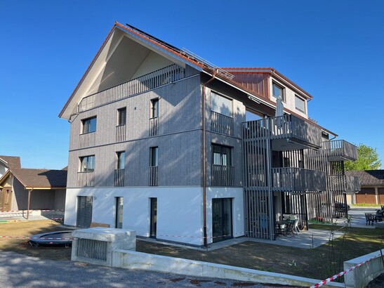 The apartment building in Wäldi in the canton of Thurgau is a replacement for a barn that previously stood on the same site. The new four-storey building on Dorfstrasse now houses 8 spacious apartments of owner-occupied standard. The building is characterized by its spacious rooms. They are flooded with light, while the exposed wooden ceilings create a comfortable living environment.