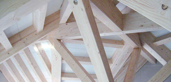 On the massive basement a building with three floors was erected in timber construction. The wall elements were realized in timber frame construction. For the floor slabs, a board stack construction was chosen. These were boards stacked on edge and held together by beechwood dowels due to the clamping forces. Glue and metal fasteners were not used.