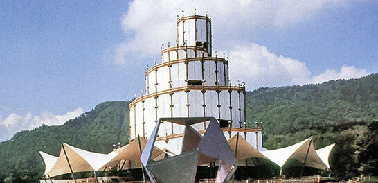 The requirements were high! For example, 400 kg/m² was required as a live load on all floors. The desired 50 m height could only be achieved with assembled tree trunks. In addition, there was a 5 m wide ramp that spiraled 330 m around the tower. The raw material: 2,000 m³ of round timber*. Despite a very short time, only 3 months, the tower was completed on time for the start of the exhibition. It was used for 6 months and then dismantled.